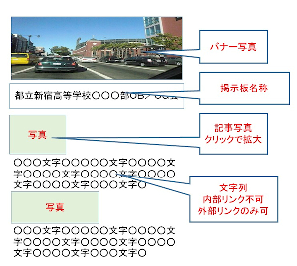 ・内容: 掲示板につけるべきタイトル、所属OB・OG会名など