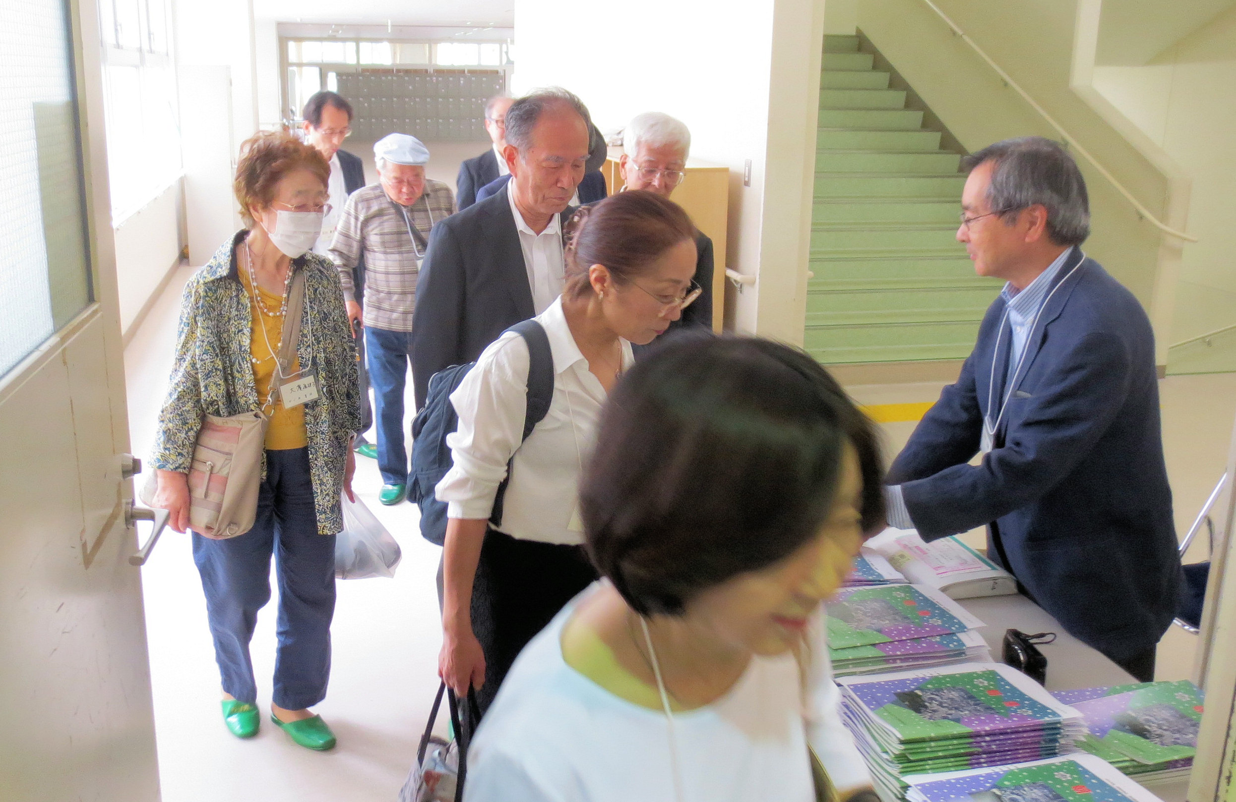 3階の視聴覚室入り口で資料(議事案、朝陽67号など)手渡し