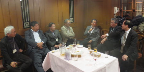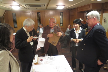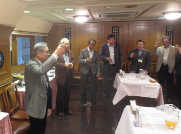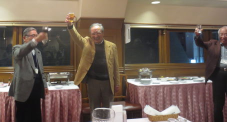 河東節のお話に花が咲きました。 | ゴルフから駆け付けた吉村幹事長とあらためて乾杯 |