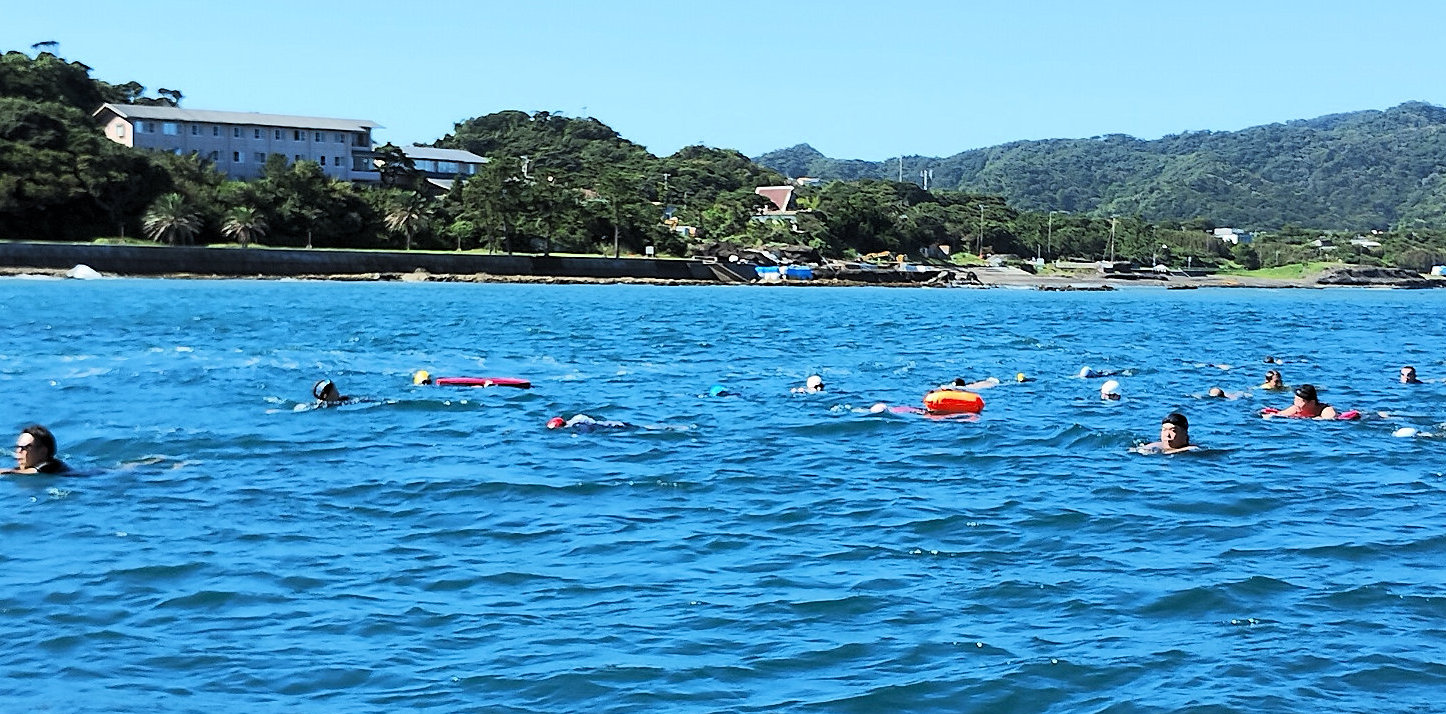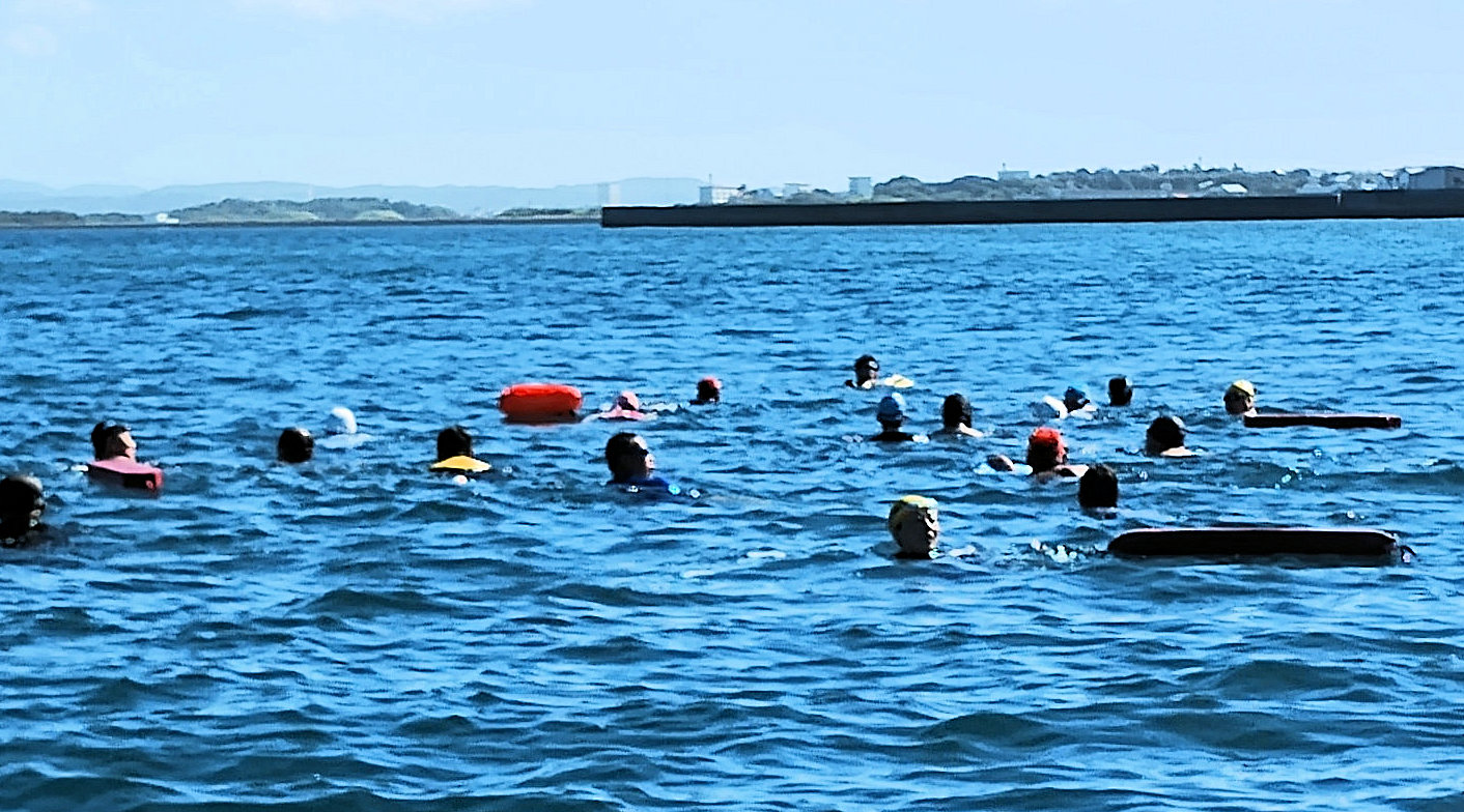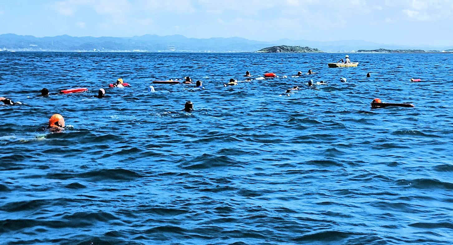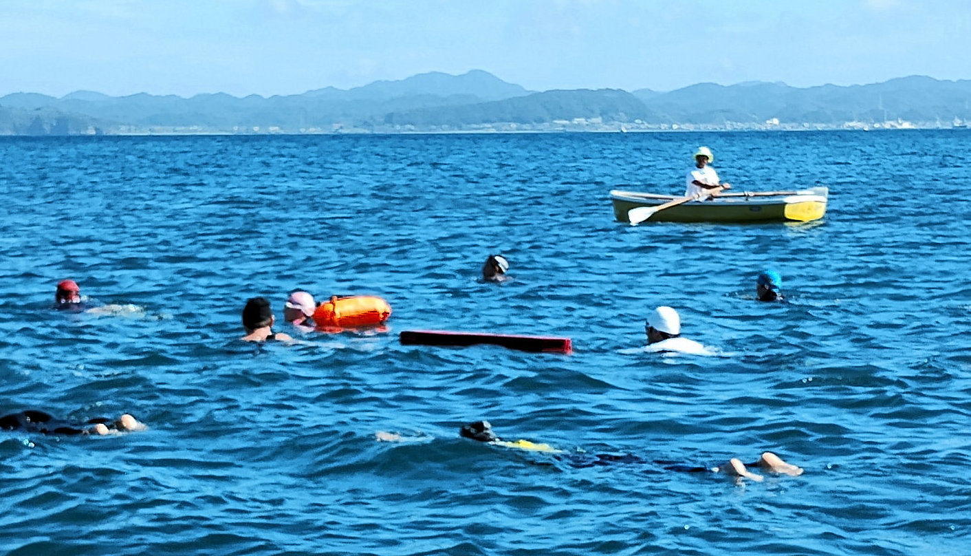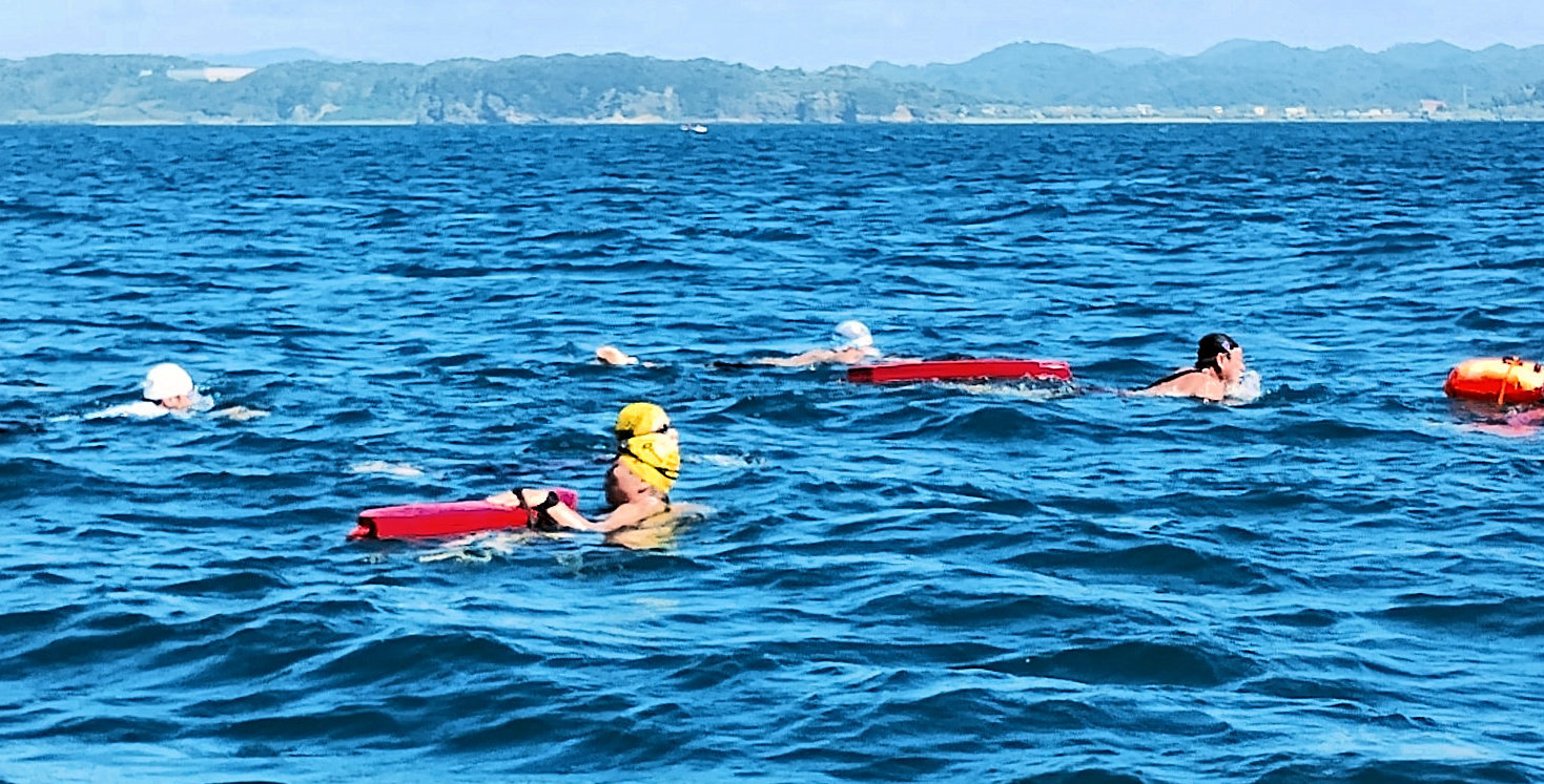 遠泳初挑戦を励ます仲間たち