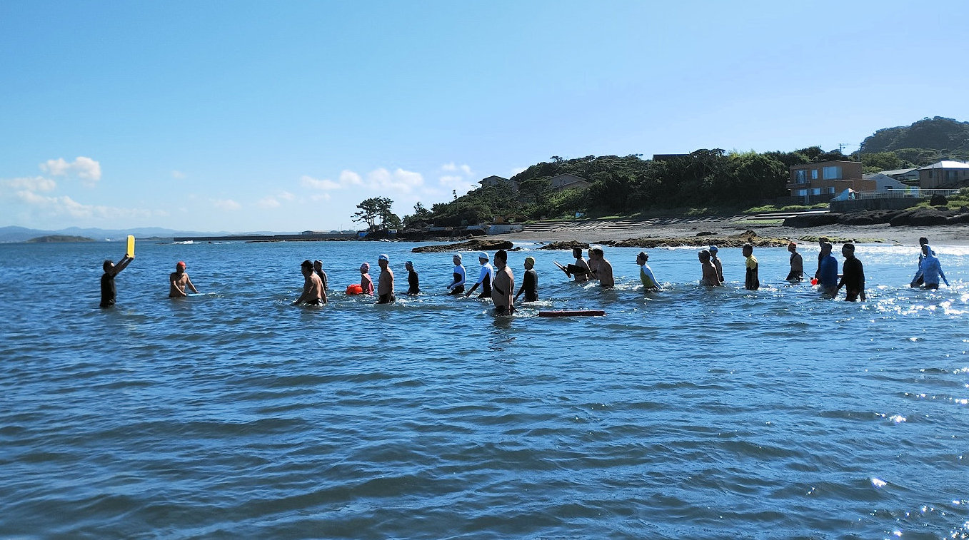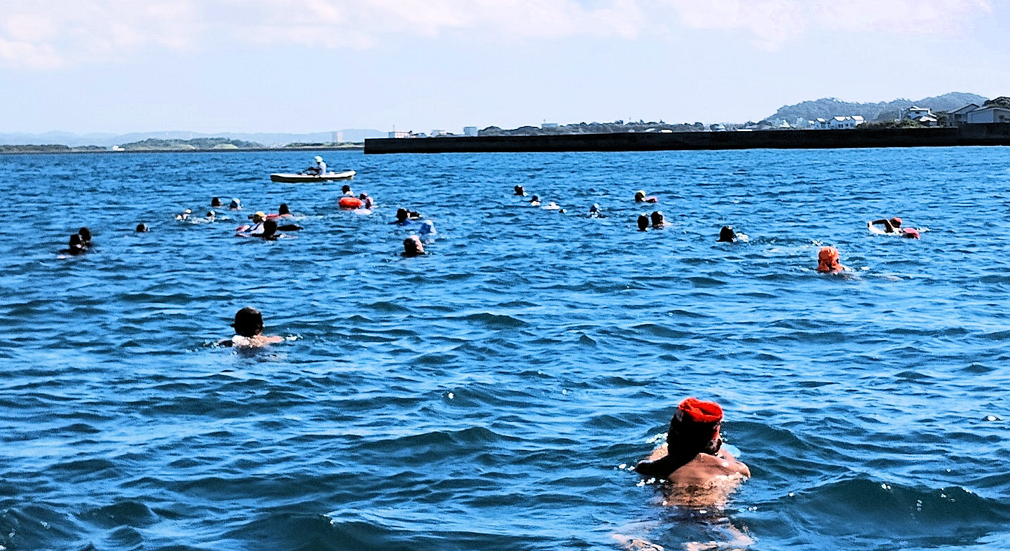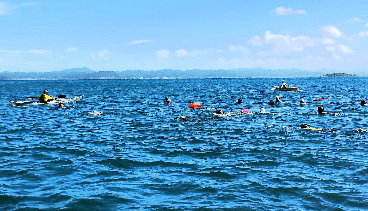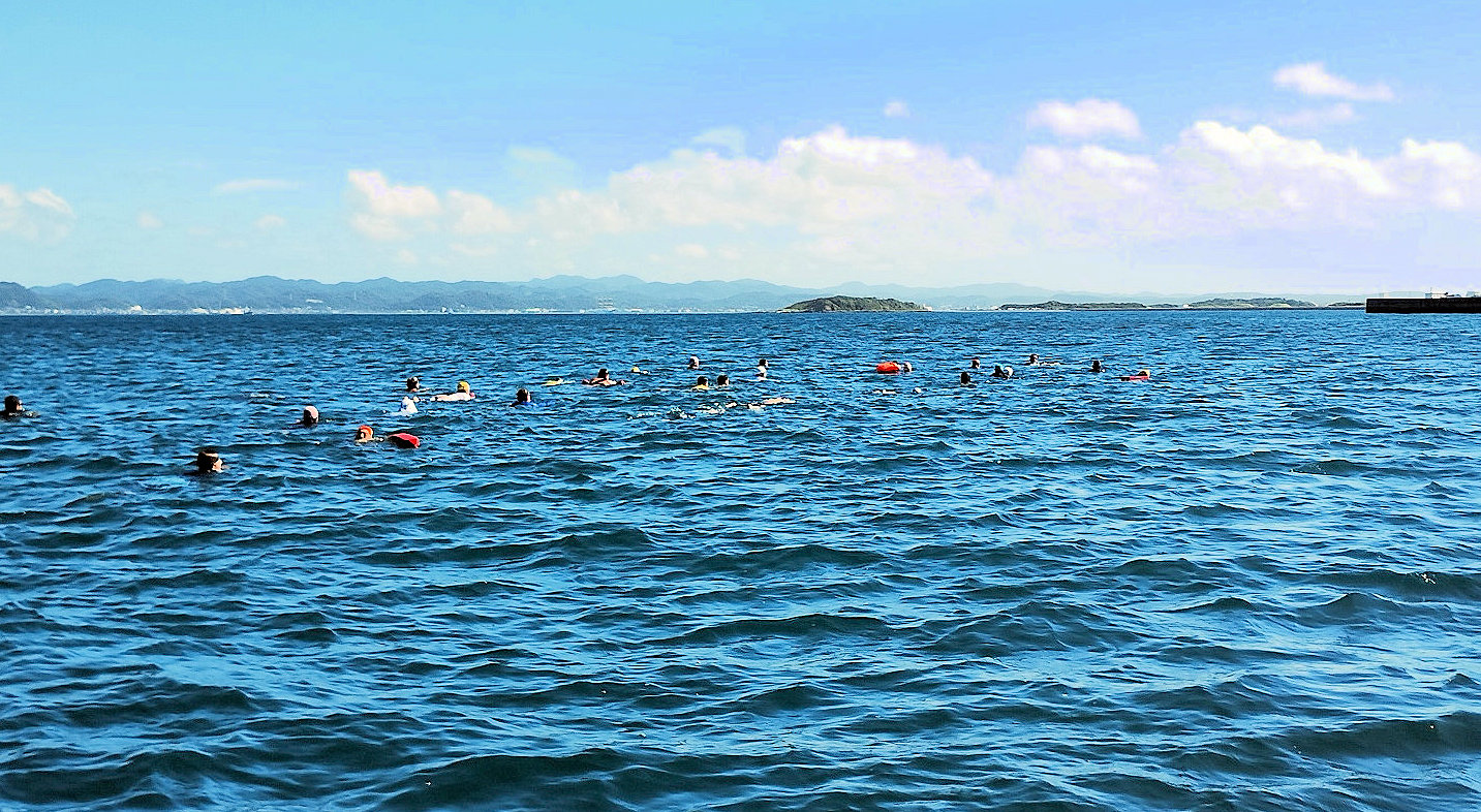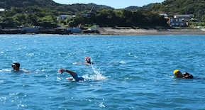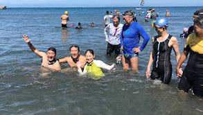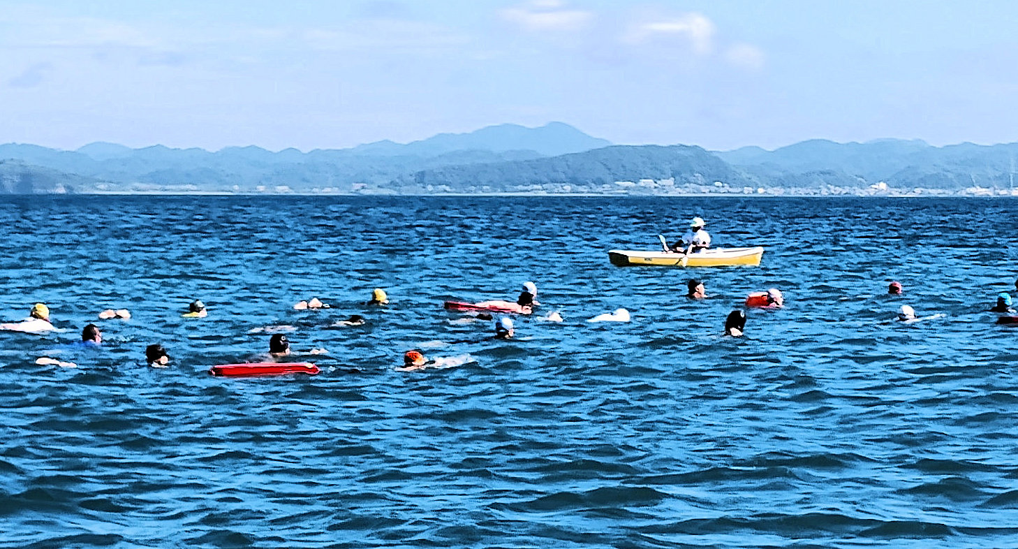 遠泳初挑戦を励ます仲間たち