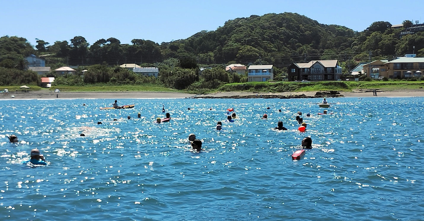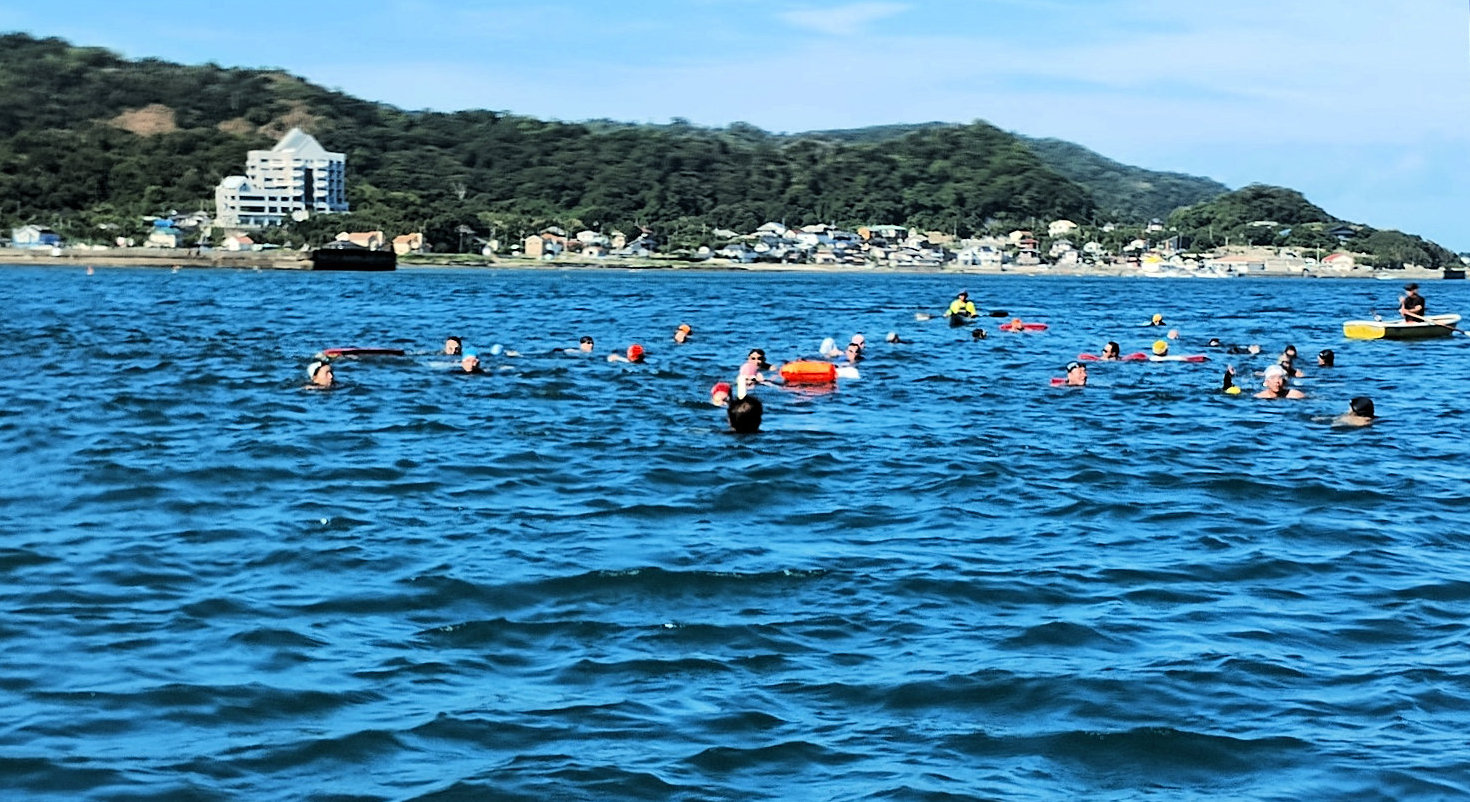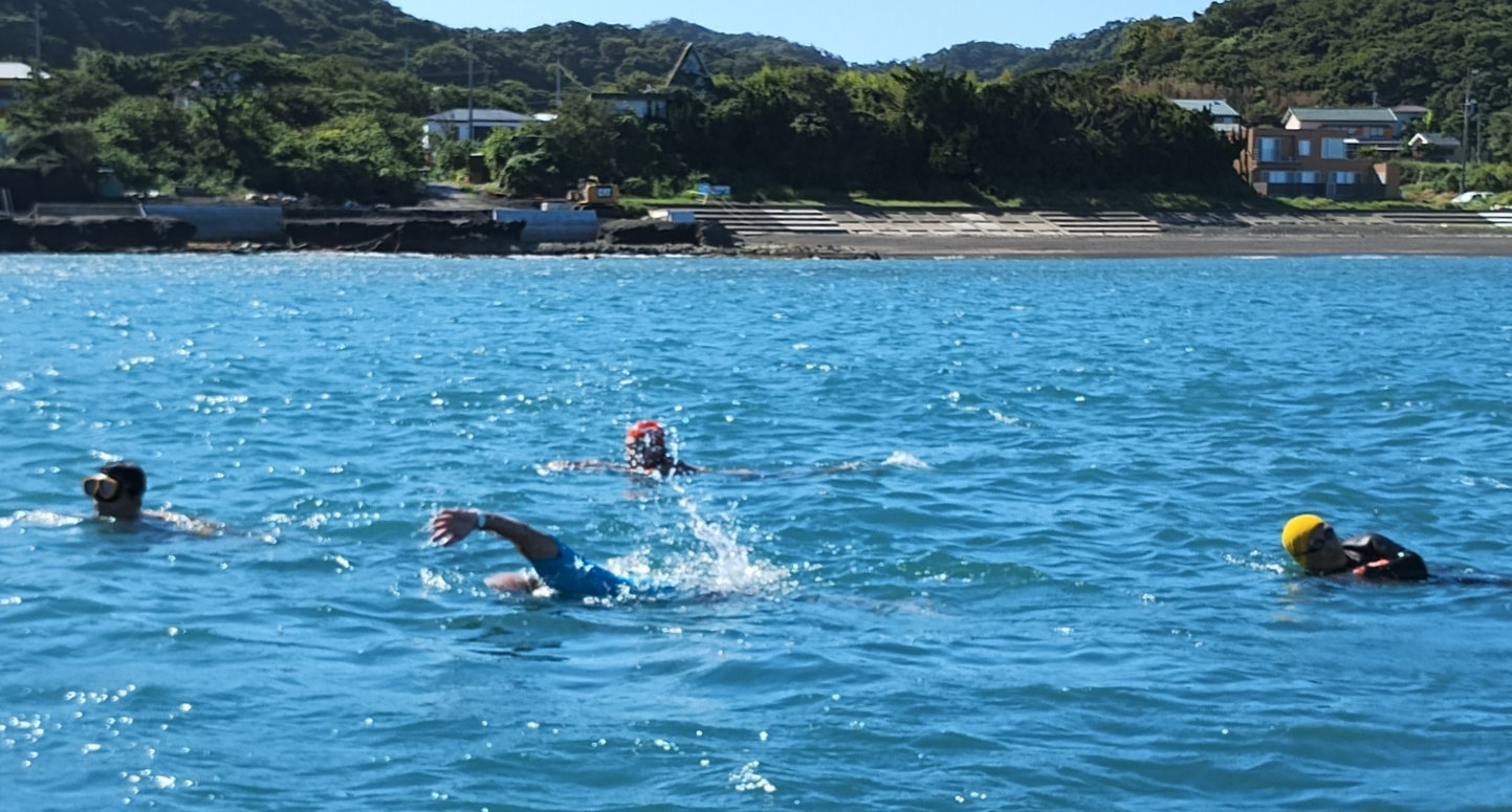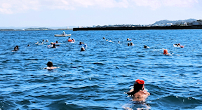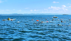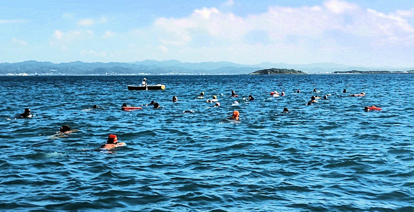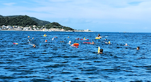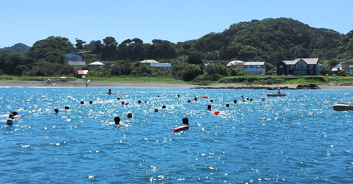 遠泳初挑戦を励ます仲間たち