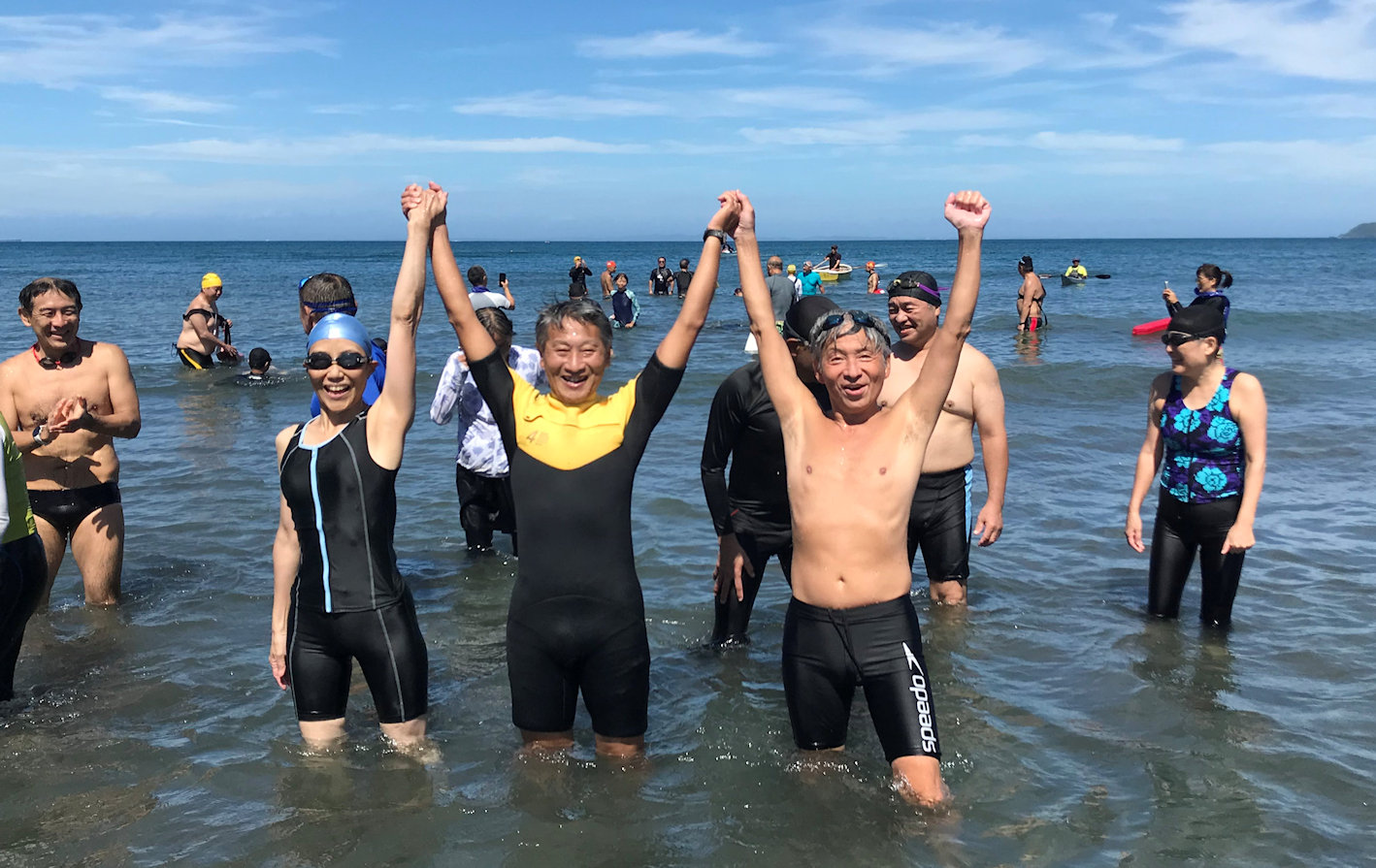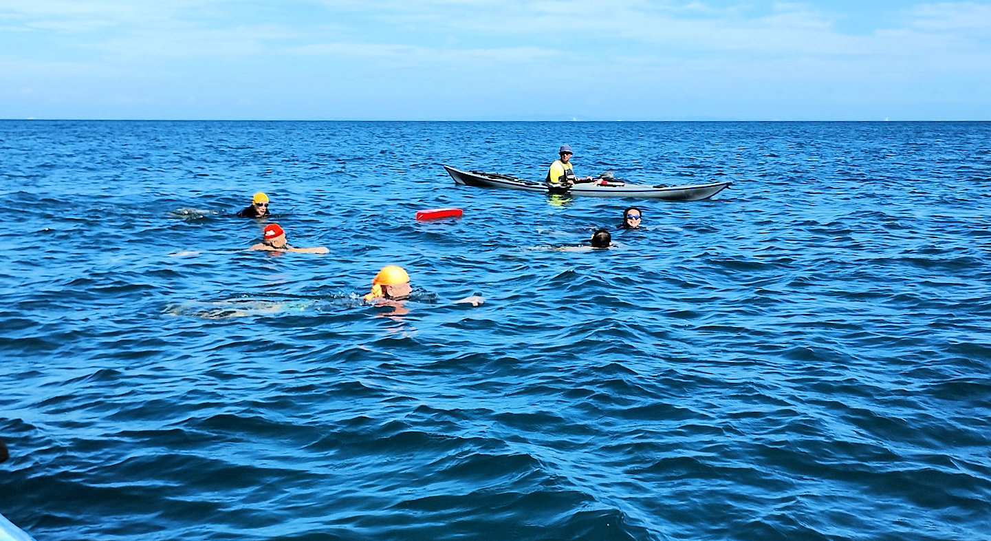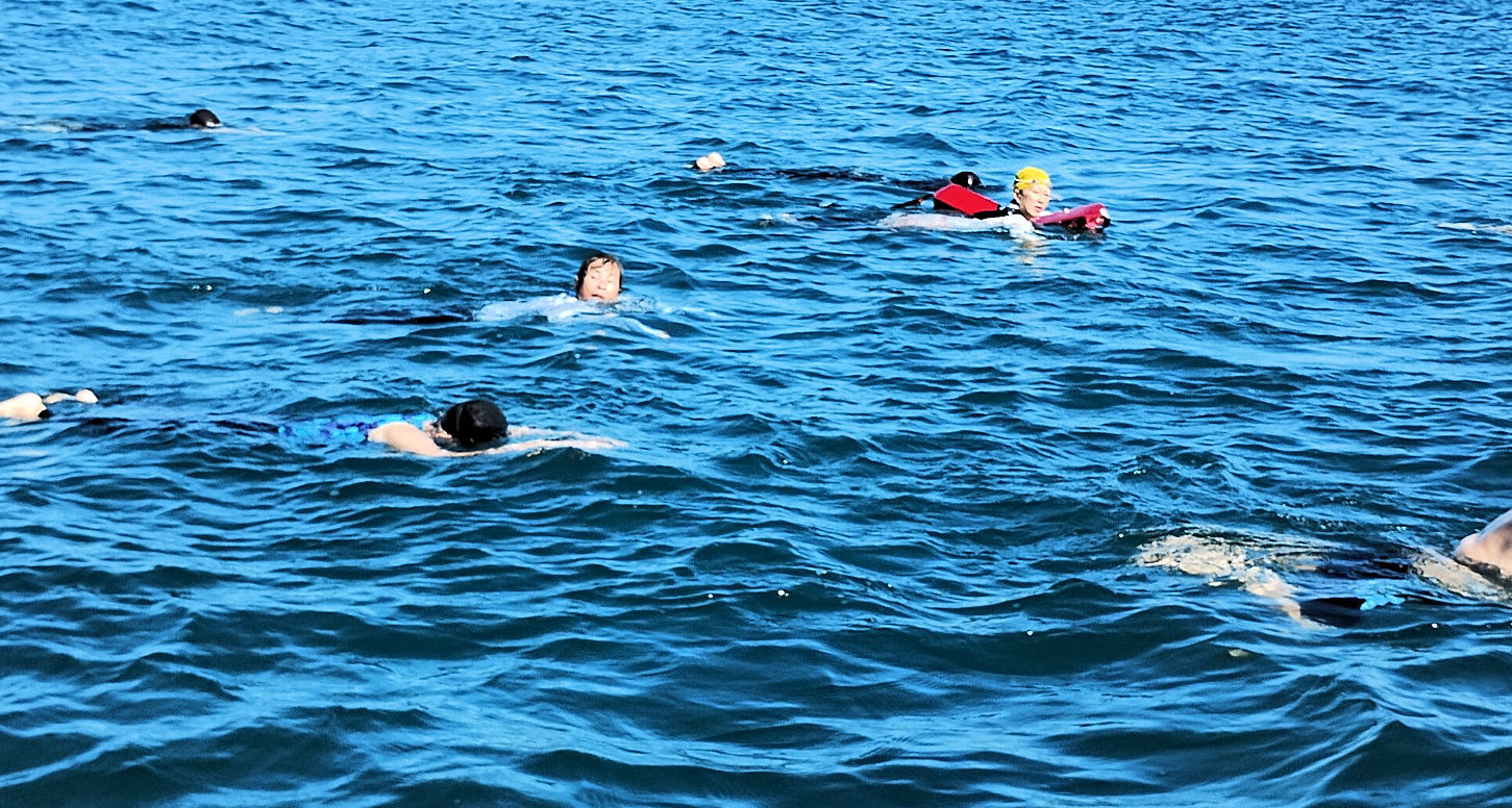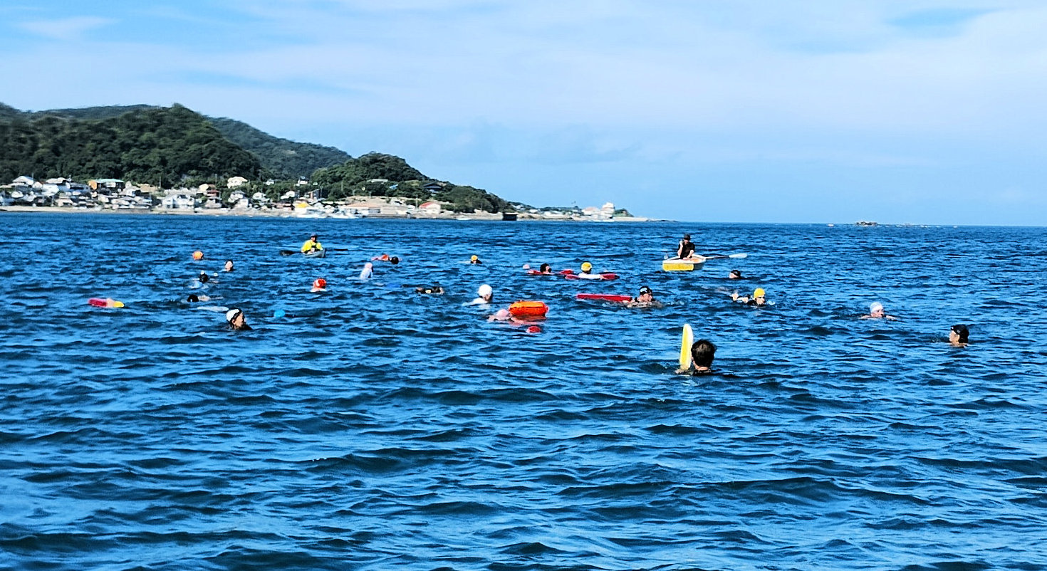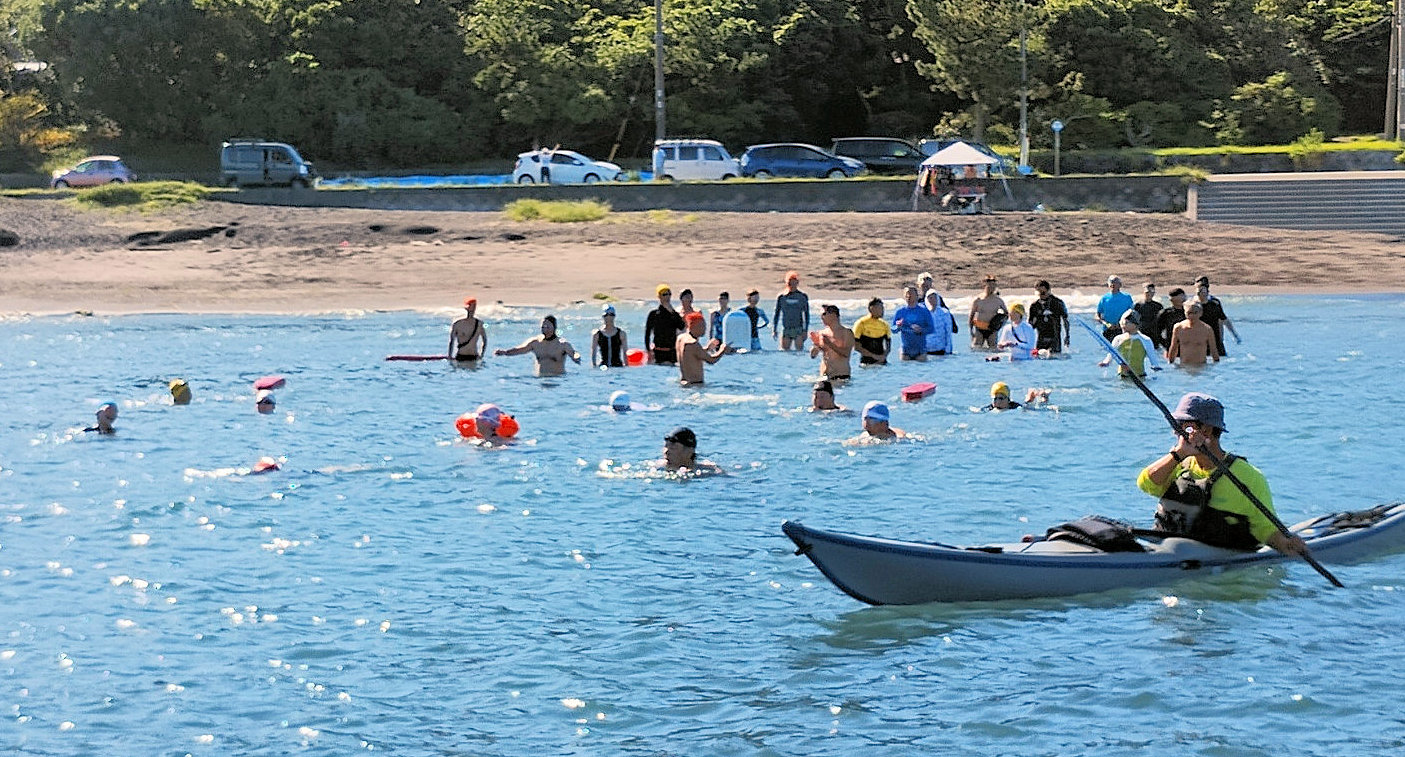 遠泳初挑戦を励ます仲間たち