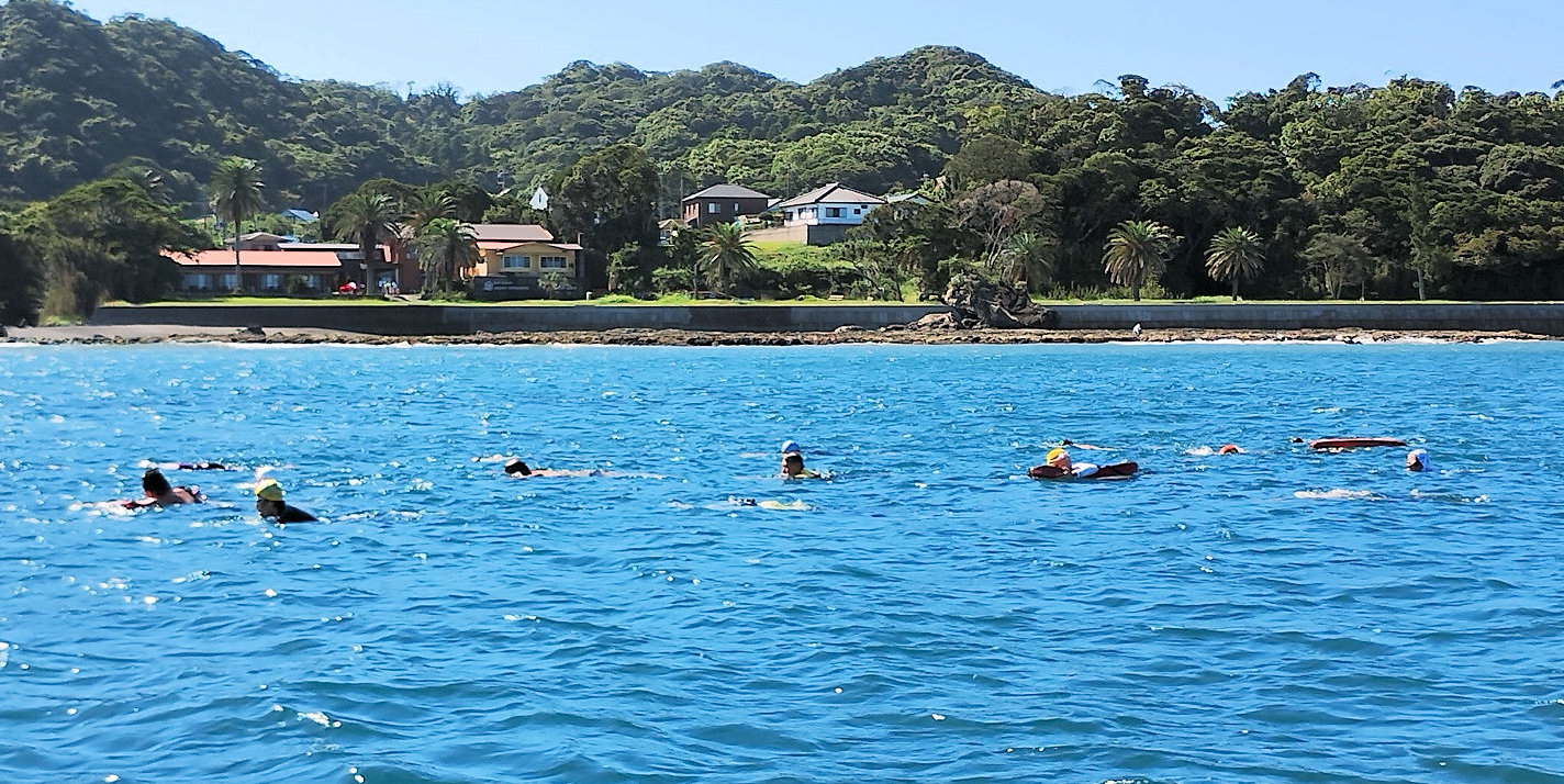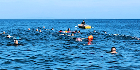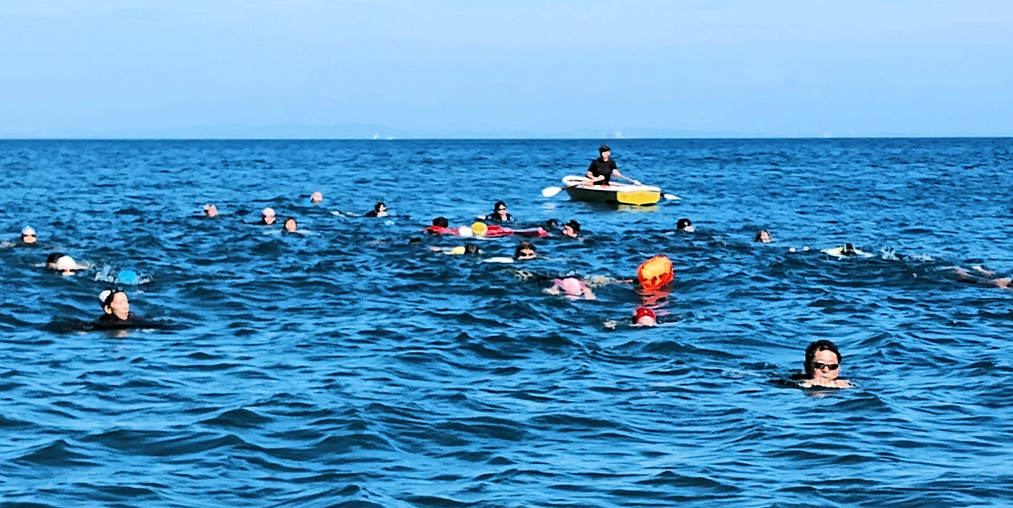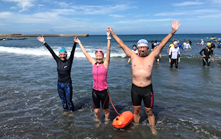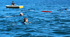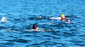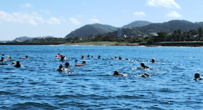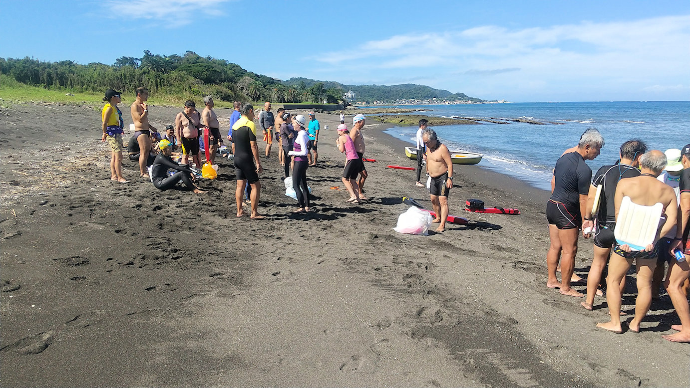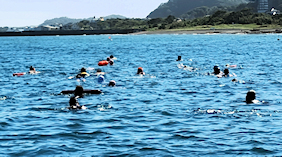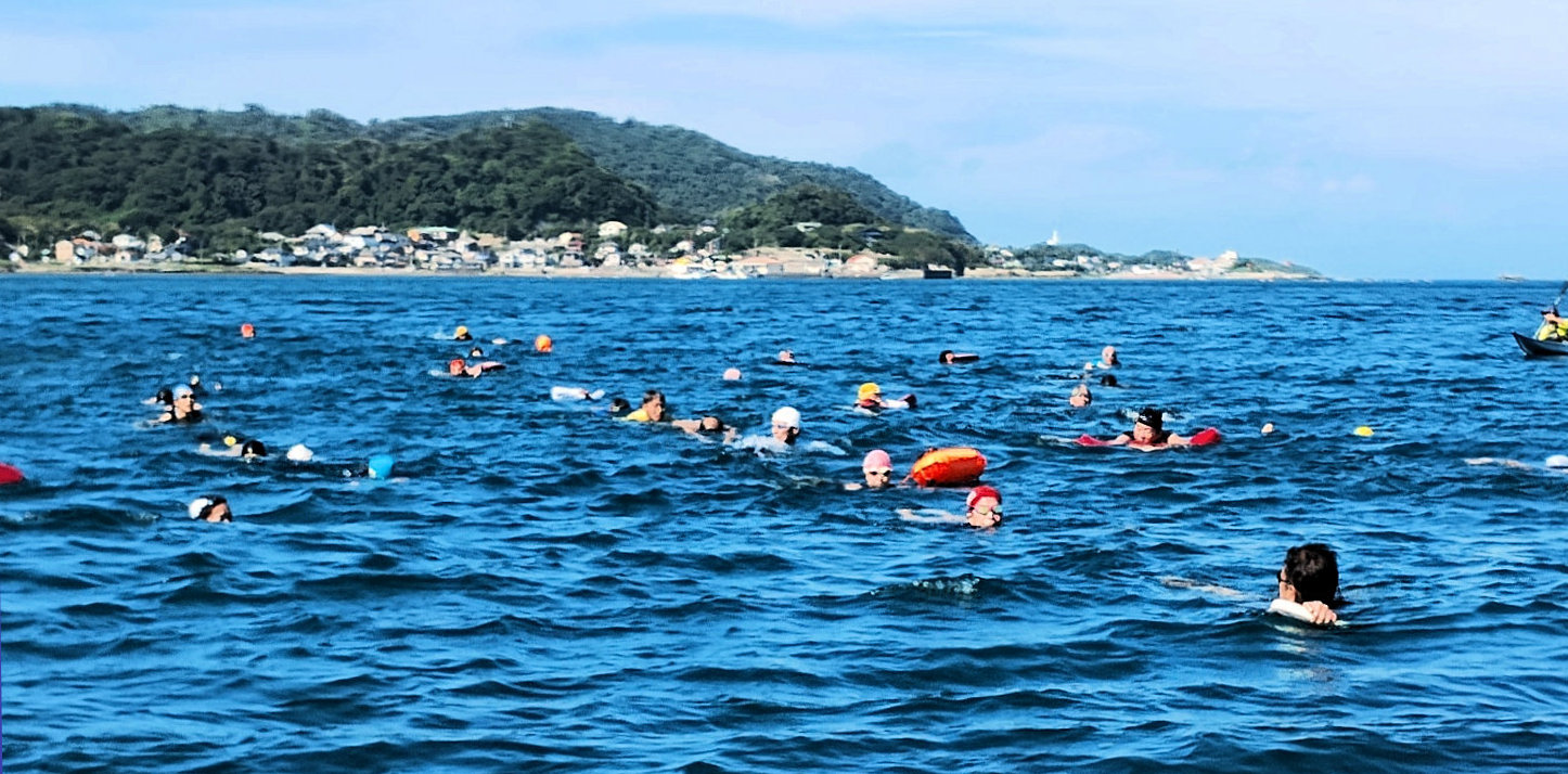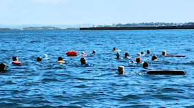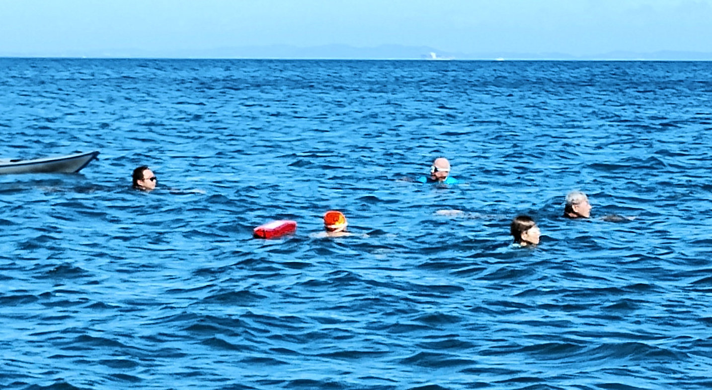 遠泳初挑戦を励ます仲間たち
