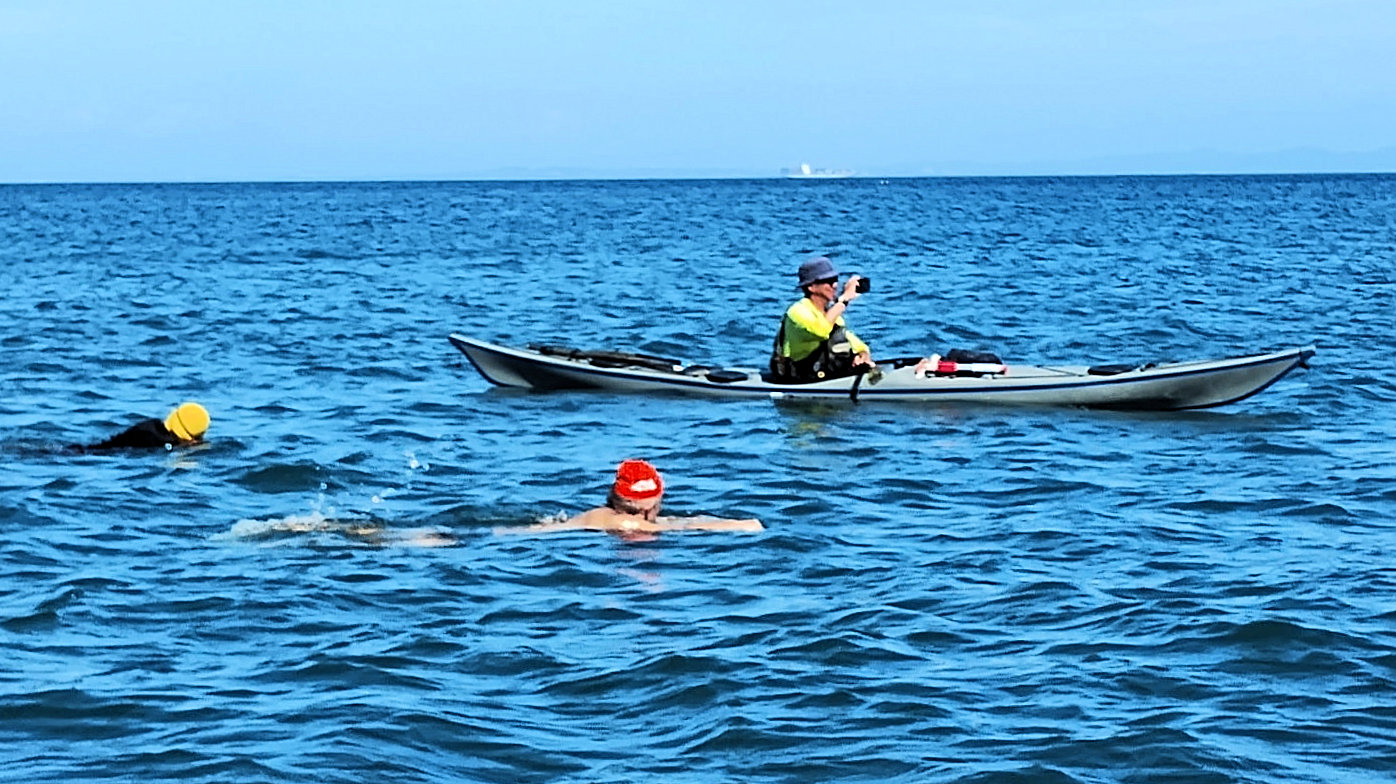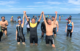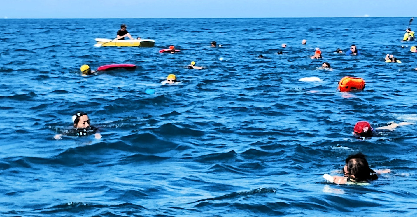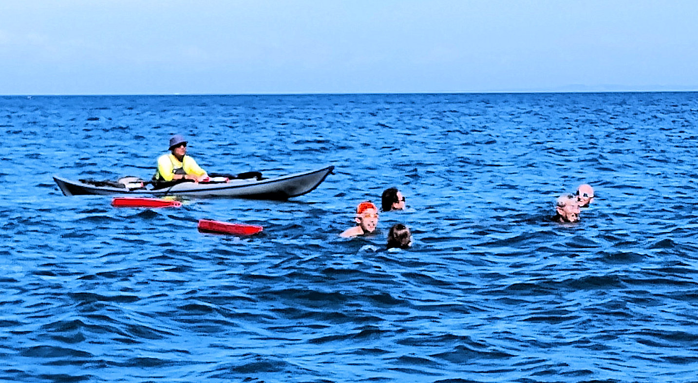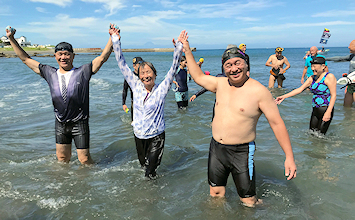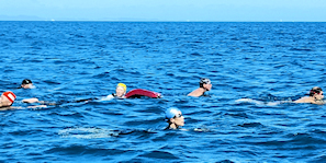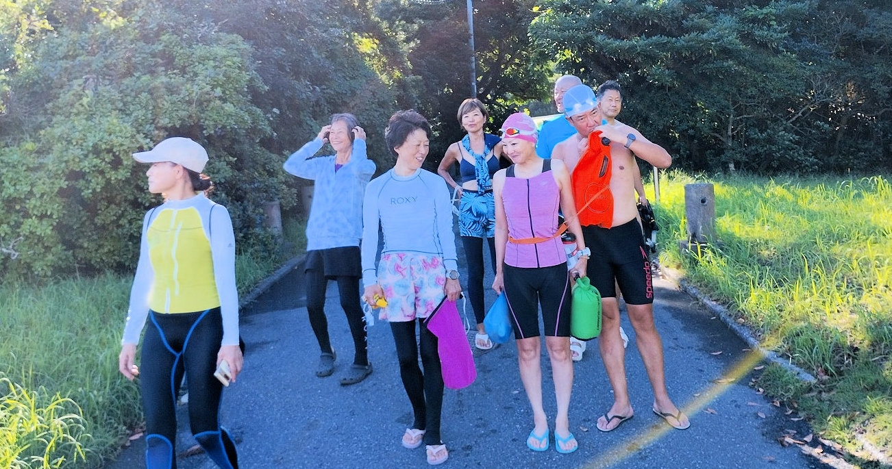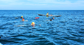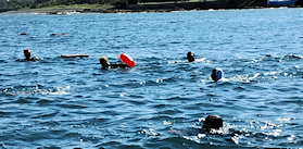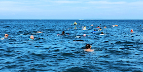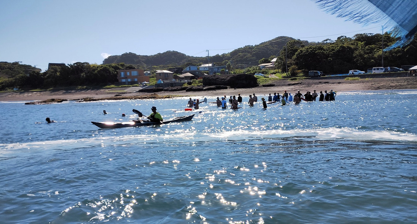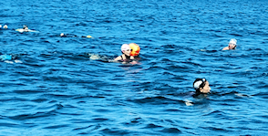 遠泳初挑戦を励ます仲間たち