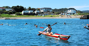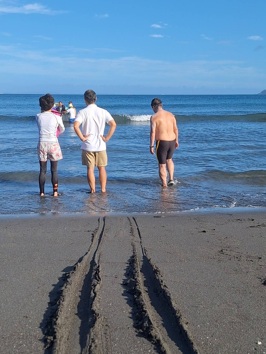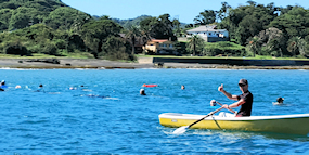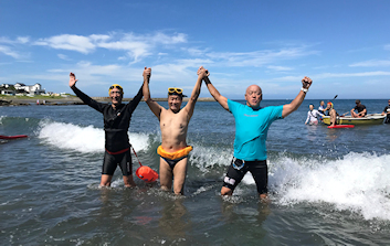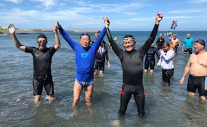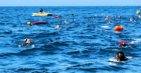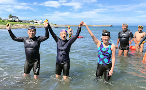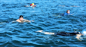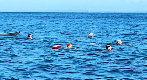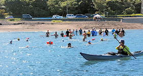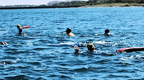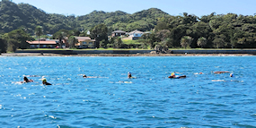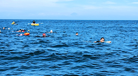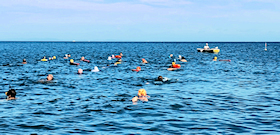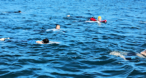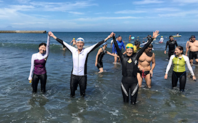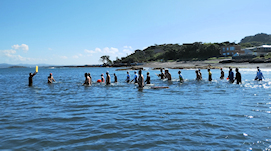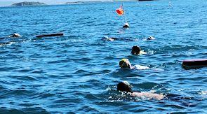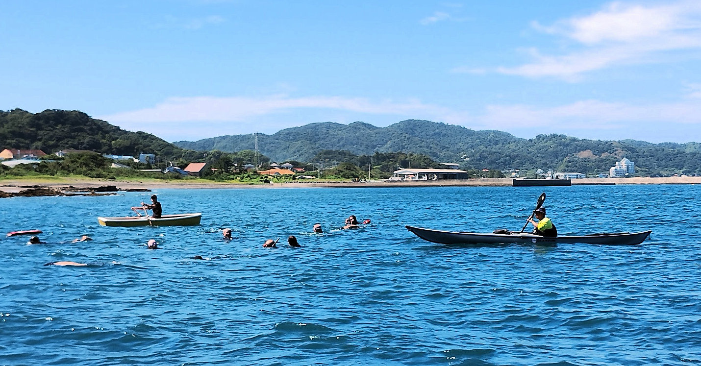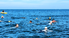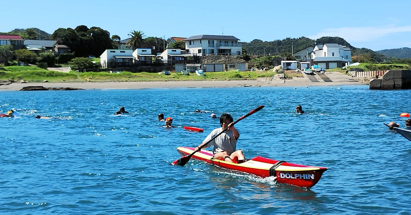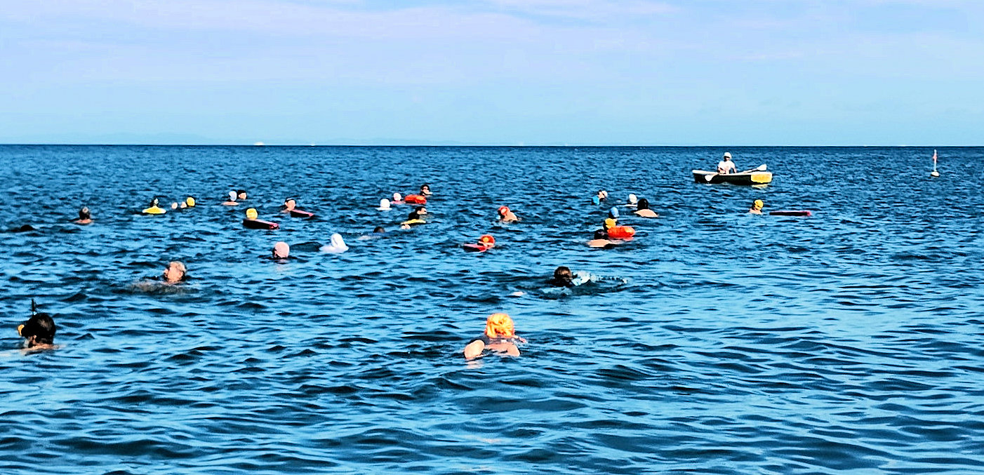 遠泳初挑戦を励ます仲間たち