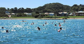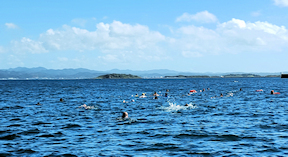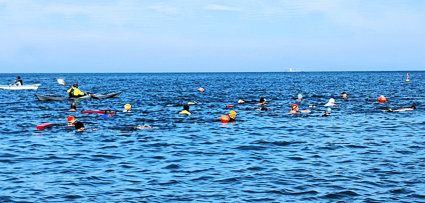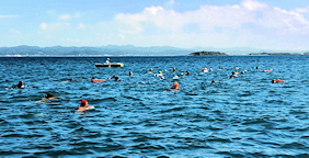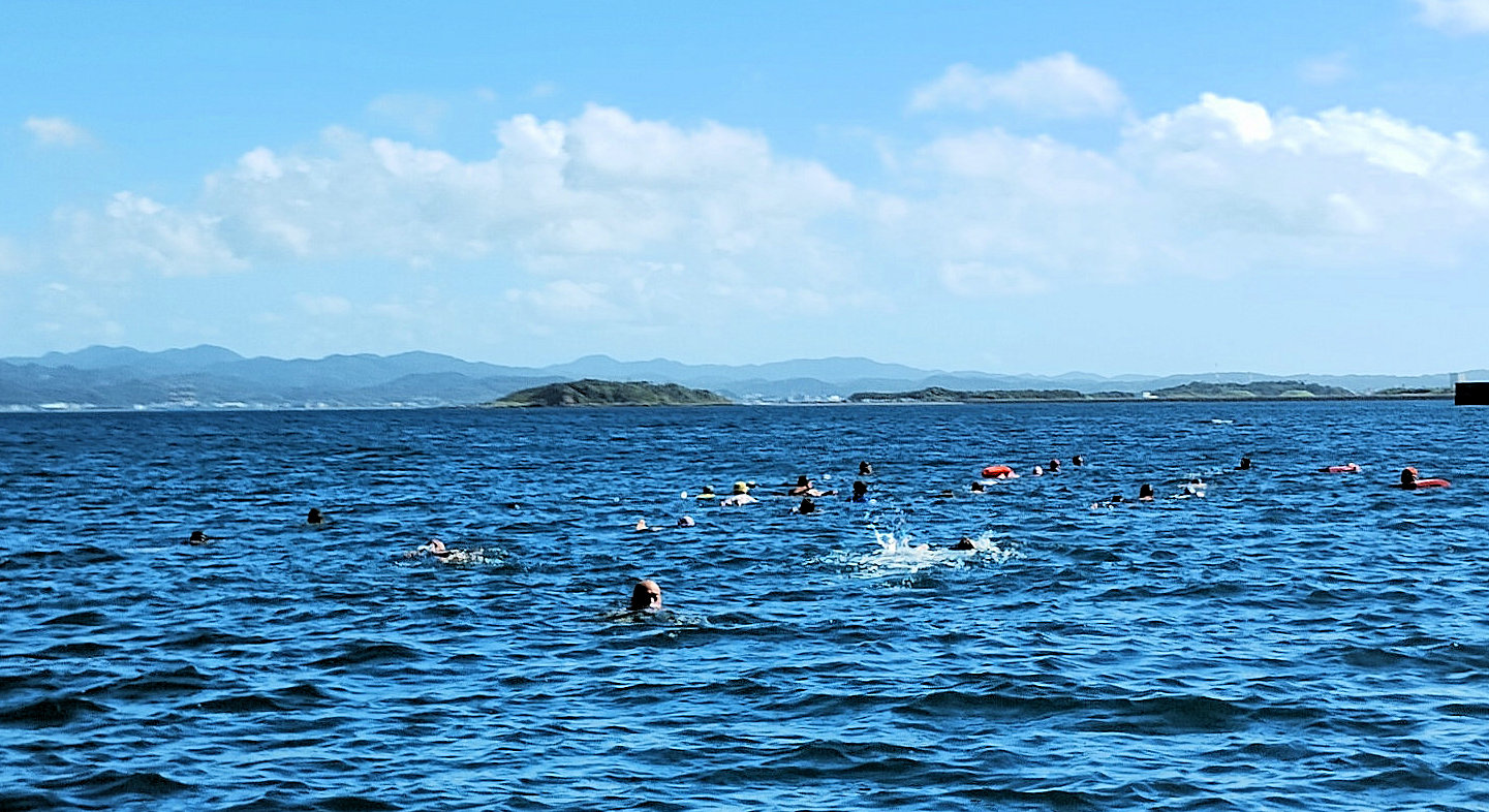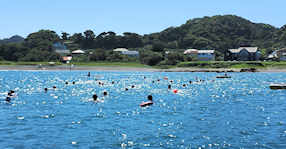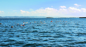 出発地点の見物海岸から遠泳コースを望む 途中小休止地点を経由しておおよそ3km弱のコース