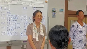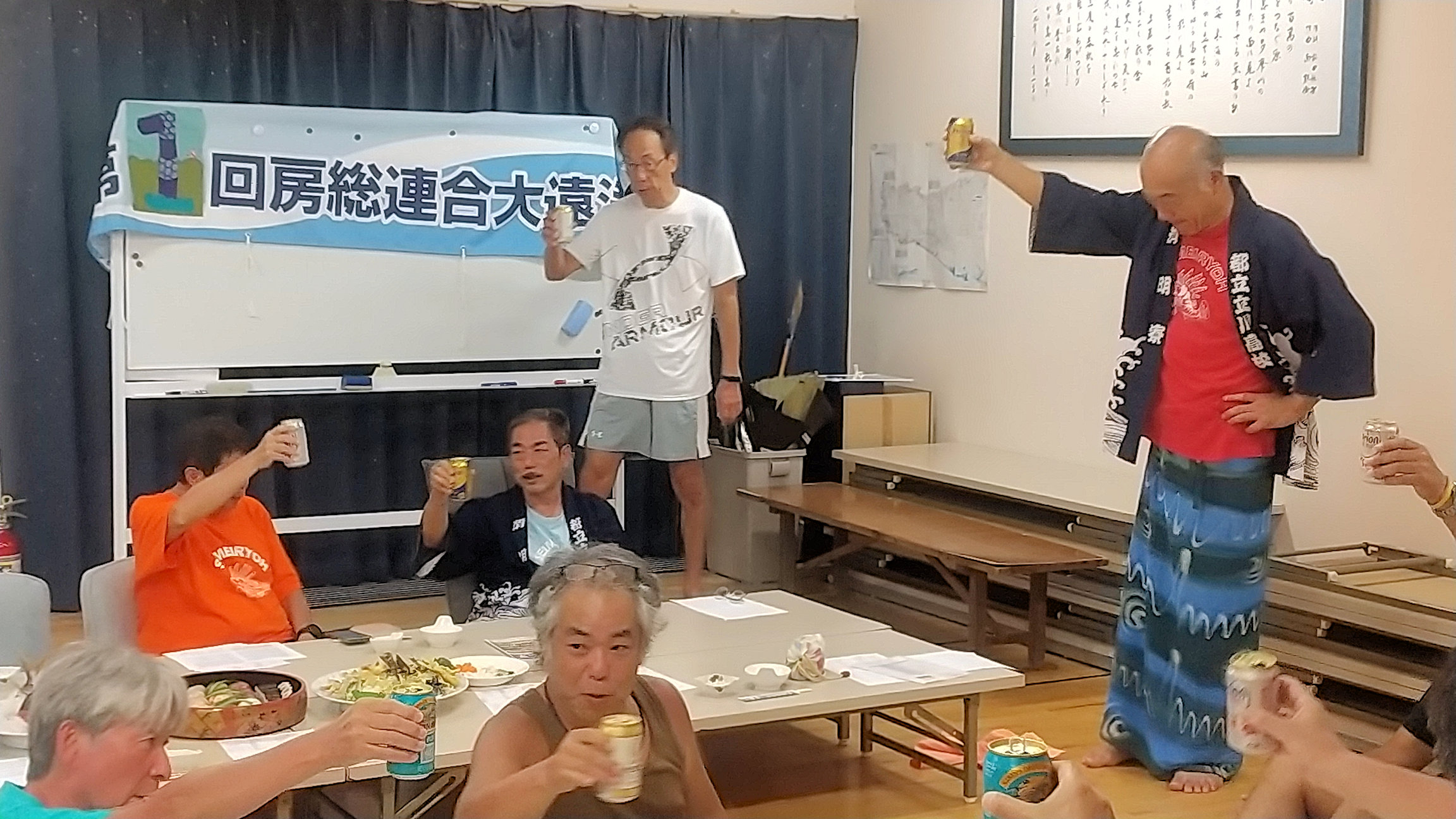 房総連合大遠泳の記念手拭いの紹介をする新宿高校38回細野さん