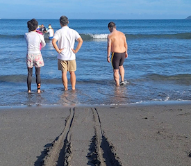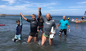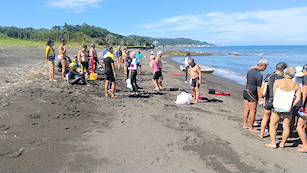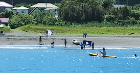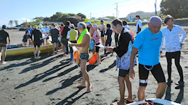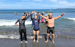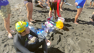 浜で完泳を出迎える仲間たち