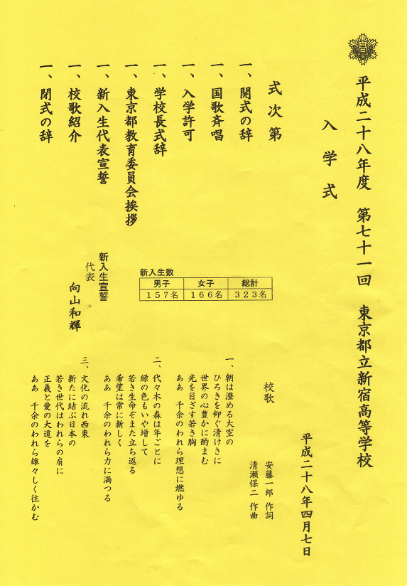 男子157名、女子166名、合計323名の新入生が、晴れて憧れの新宿高校の門をくぐりました。