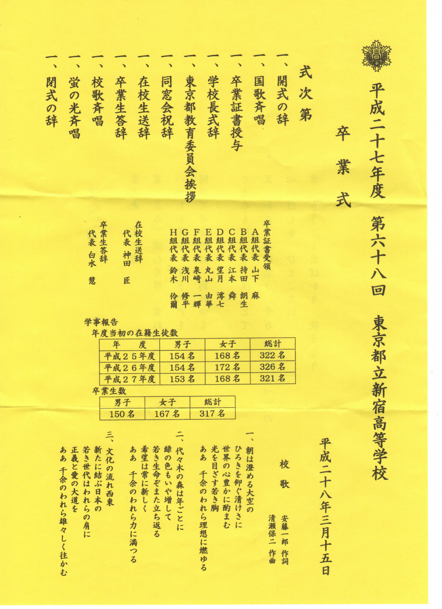 第68回卒業式が3月15日(火)、母校3階体育館で挙行され、男子150名、女子167名、合計317名の68回生が、夢と希望を胸にそれぞれの道へと旅立ちました。