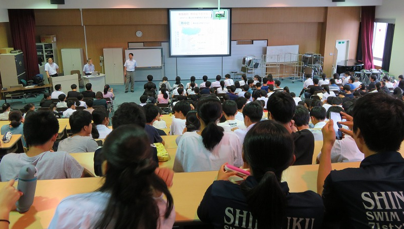 終業式を翌々日に控えた2018年7月12日(木)午後、馬場悠男さん(15回 人類学者 国立科学博物館名誉研究員 医学博士)が、母校生活指導部セーフティ教室の依頼を受けて、1年生、2年生、それぞれ320名を対象に、「熱中症予防対策と人類進化」と題して特別授業を行いました。