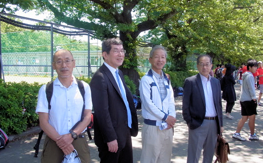 また、硬式テニスの試合には、今年秋のOBOG会結成を目指す先輩テニスプレイヤー5人が応援に駆けつけ、顧問先生と現役部員と挨拶を交わすなどエールを送っていました。