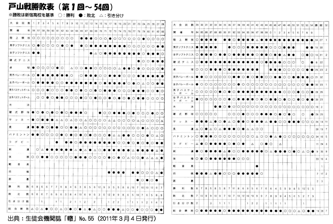 戸山戦勝敗表(第55回~60回) | *勝敗は新宿高校を基準 ○:勝利 ●:敗戦 △:引き分け | ||||||||||||||