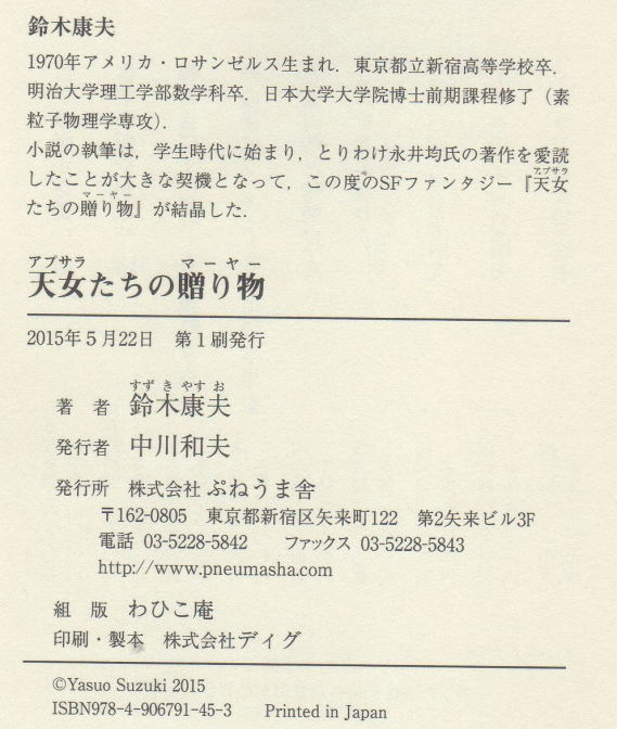 鈴木康夫さん(41)から、ぷねうま舎刊行哲学的なSF小説『天女たちの贈り物』を寄贈