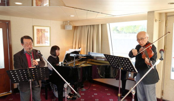 船上では、会員の三重奏(ビオラ:岩田 誠、クラリネット:小倉 愈、ピアノ:竹内[徳永]敦子)の演奏を聴いたり1時間弱の楽しい船旅でした。