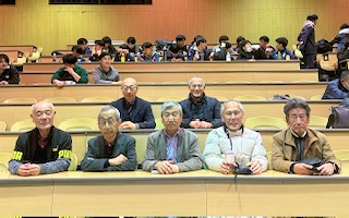 交流戦には今年の卒業生を含めOB20名が参加。最長老は16回生の島井さん(78歳)で、30回、32回、元顧問の本宿先生のいる60回、61回生たちがプレー。 30歳を過ぎた60回生あたりのOBは六蹴会の中では子供、現役たちは孫と言ってよい世代です。