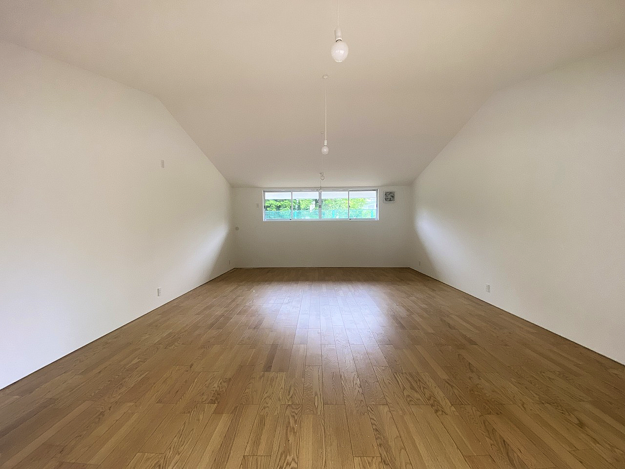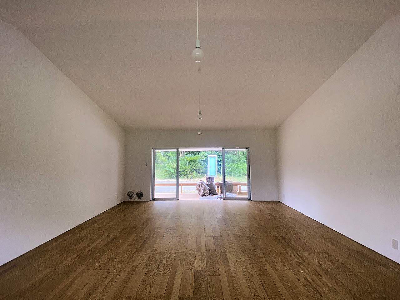 室内の模様 山側から海側を見たもの 床はフローリングです。宿泊者用には布団を用意します。