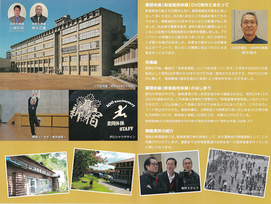 昭和28年(1953年)頃に創作され今も生徒たちに引き継がれてきたあの「業間体操(現在、新宿体操と呼ぶ)」が多くの方々のご協力により、2013年にDVDに収められ完成しました。