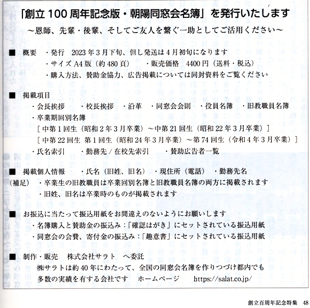 2月に記念募金の募集、記念祝賀会の案内に併せて記念名簿の作成について(株)サラトに委託することをニュースレターに記載致しました。