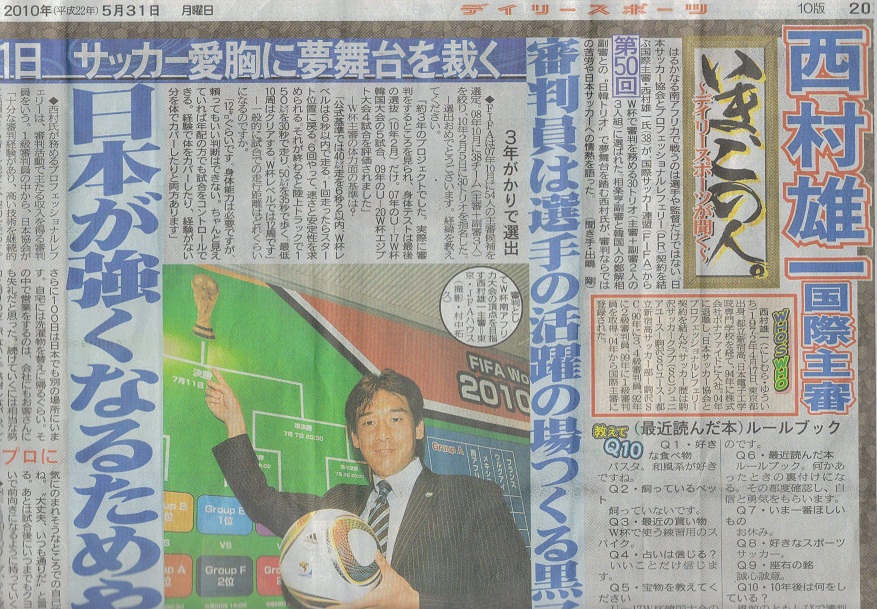 日本サッカー協会とプロフェッショナルレフェリー契約を結ぶ国際審判員である西村さんが、FIFAからW杯での審判に選ばれました。 (デイリースポーツ5月31日の朝刊より)●ブリッジ・サークルへのお誘い(平成22年6月3日掲載)