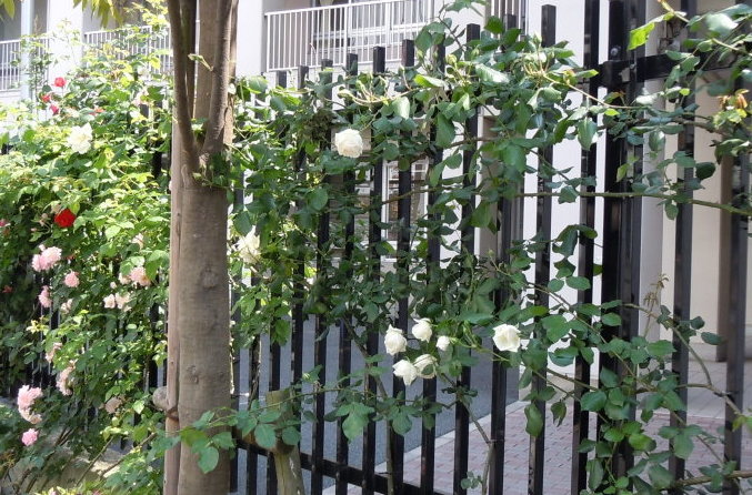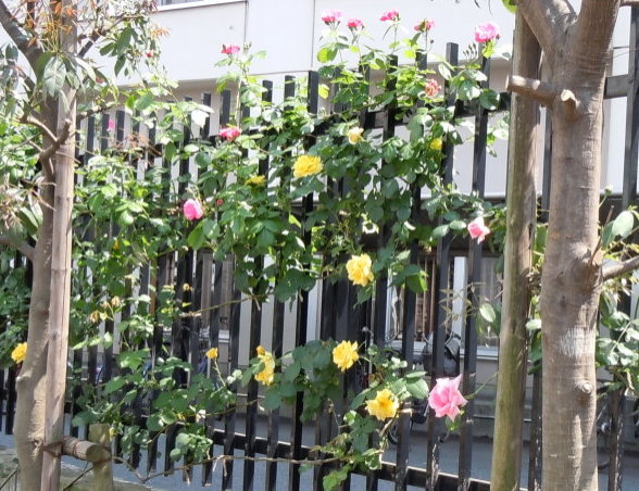 また、校門両側の塀で咲き誇るつるバラには、足を止めて見入っている多くの通行人の方が見受けられます