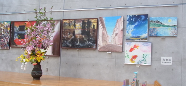 今年も母校美術部員の作品がピロティに展示