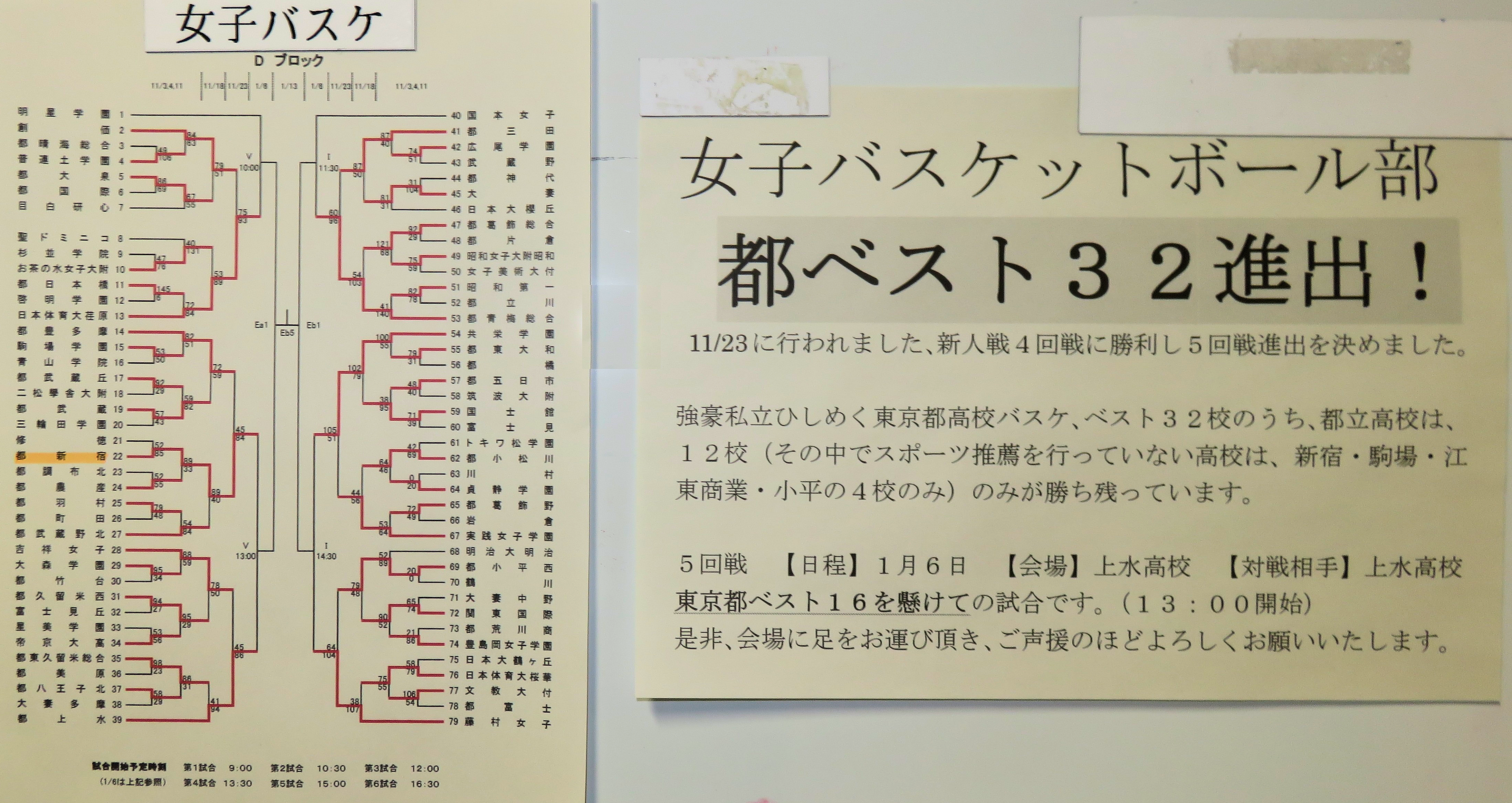 女子バスケットボール部は2018年11月23日に行われた新人戦4回戦に勝利し、都ベスト32に進出しました。