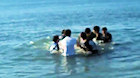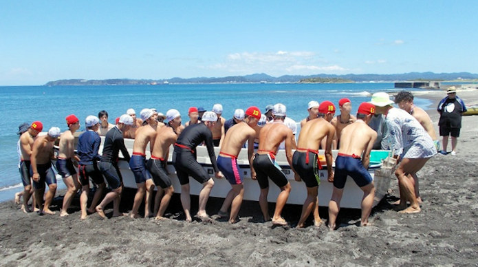トラブルがあったとき、遠泳参加者全員が船(ボートと和船)に乗れるように、万全を期して地元の漁業協同組合長の大きな和船にも助けていただきます。