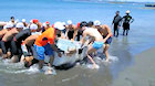 香突堤先から撮影した大遠泳の様子、詳細の解説ナレーション付き。